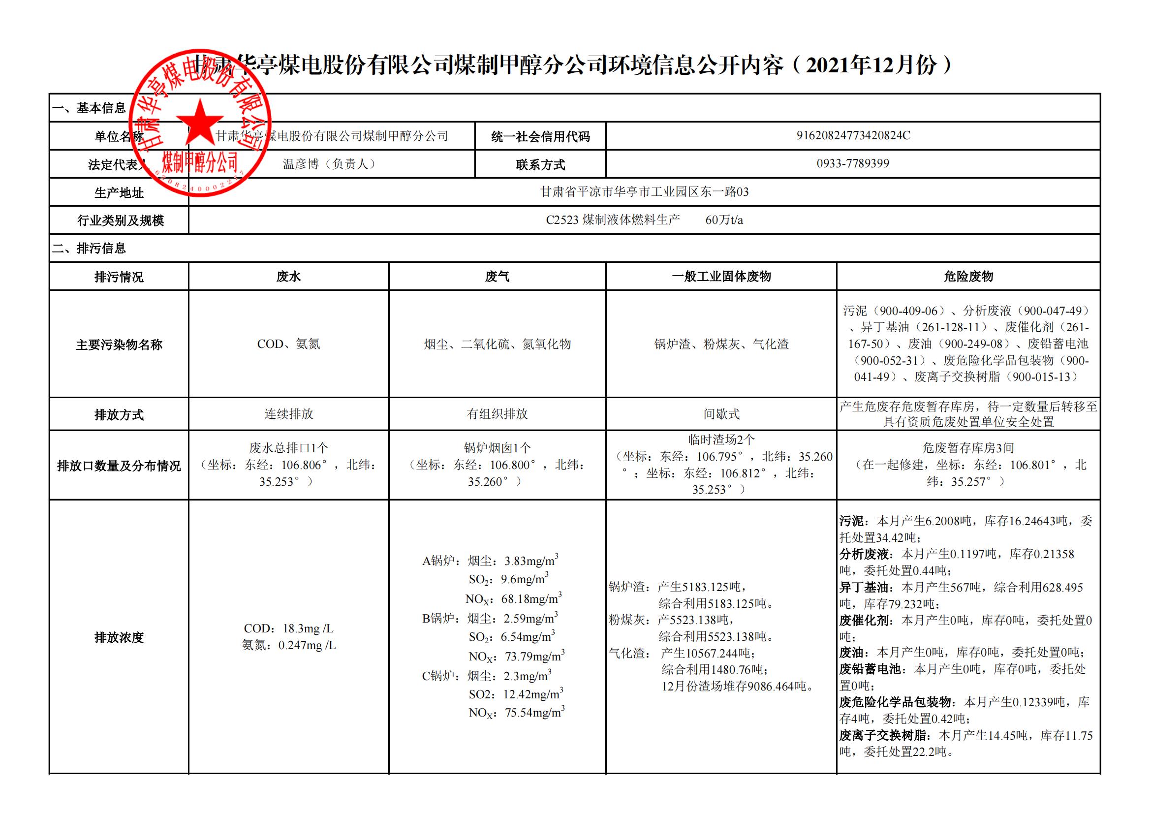 煤制甲醇分公司环境信息公开内容(2021年12月)