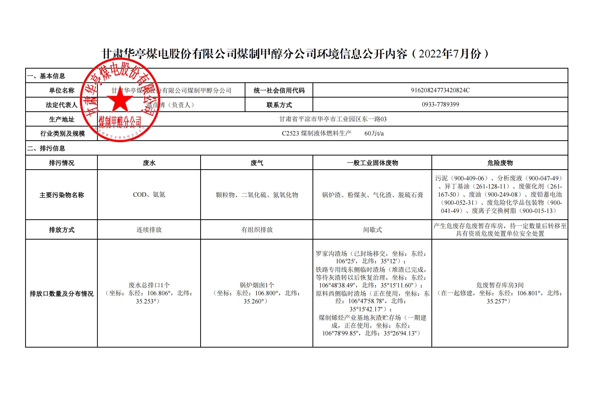 煤制甲醇分公司环境信息公开内容(2022年7月)