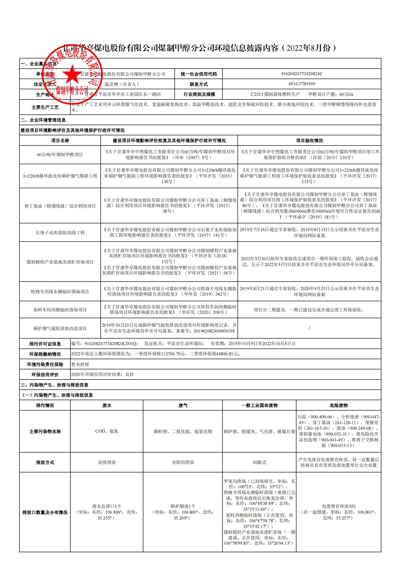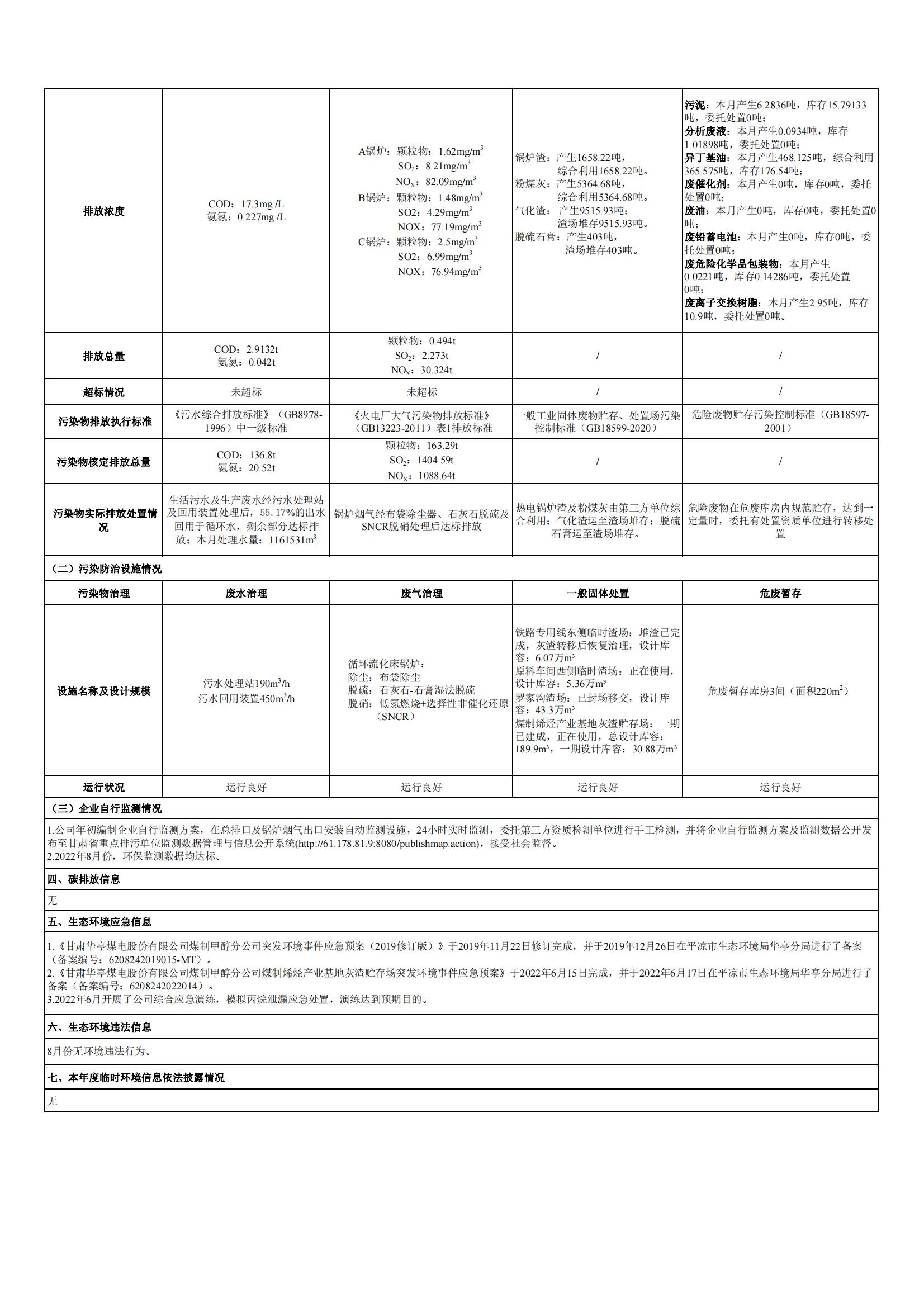 煤制甲醇分公司环境信息公开内容(2022年8月)