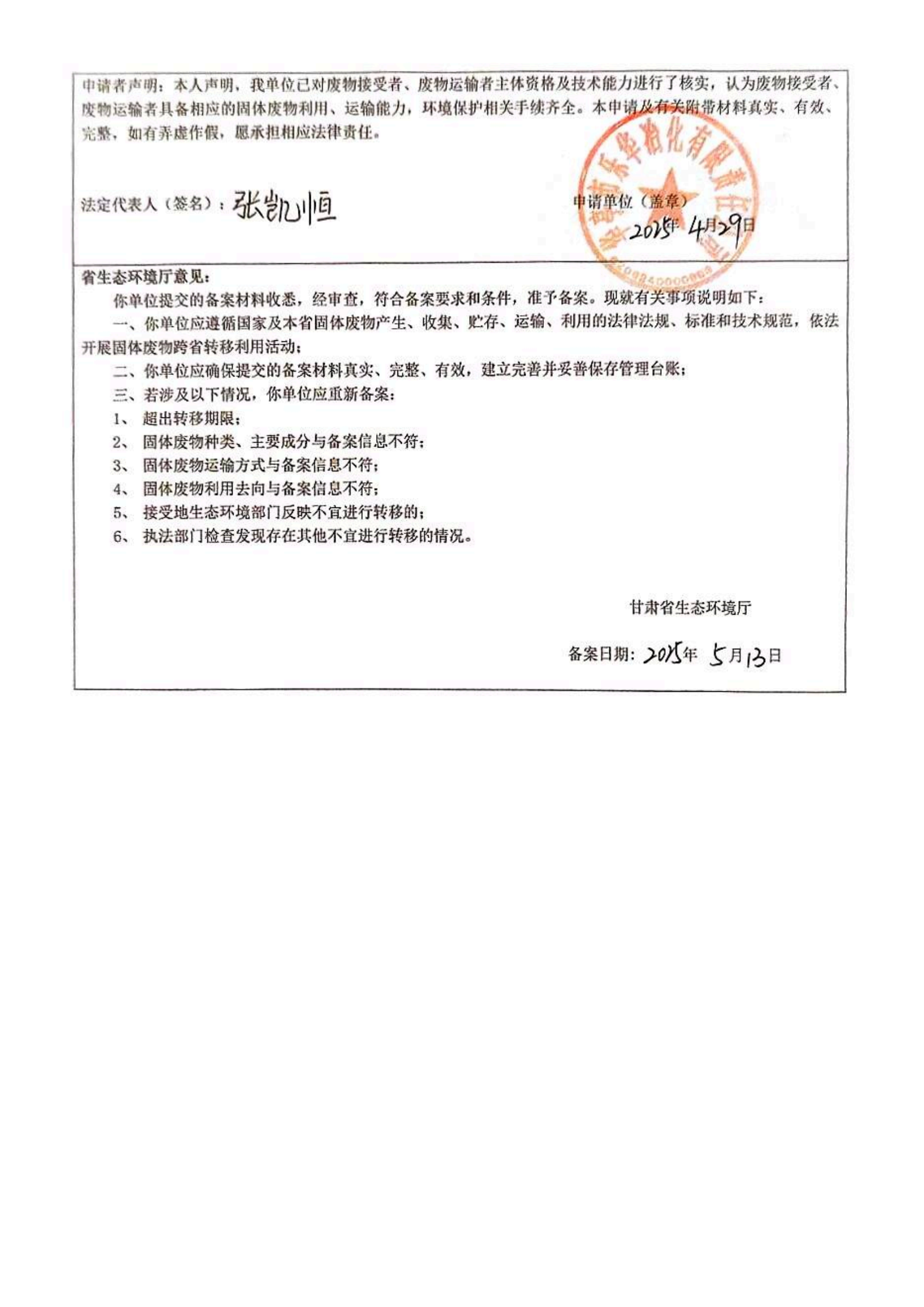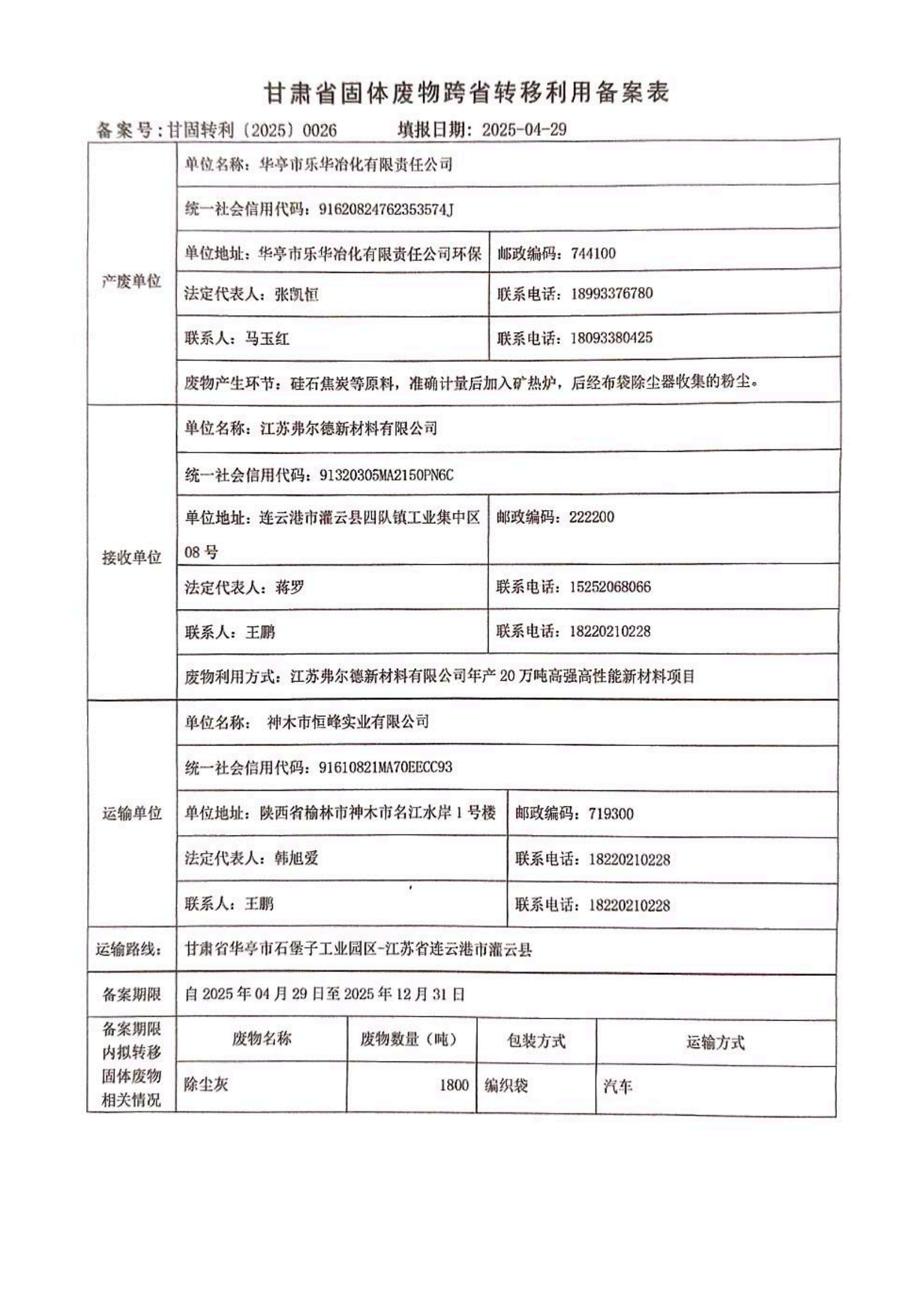 华亭市乐华冶化有限责任公司甘肃省固体废物跨省转移利用备案表